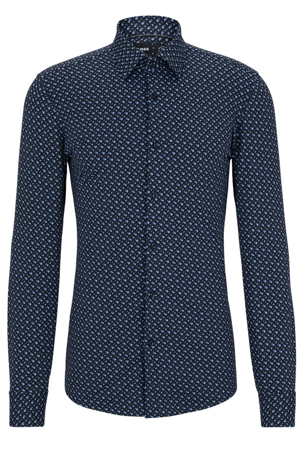 Une chemise business Slim Fit en popeline de coton stretch à carreaux ornée d’un motif à fleurs moderne, signée BOSS Homme.
