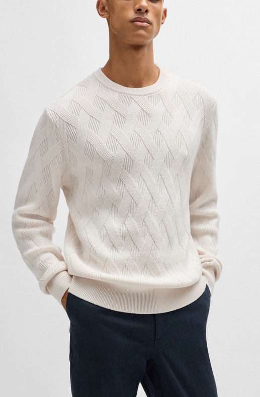 Un pull Regular BOSS à col rond. Cette pièce en maille à la structure noble est en fils doux et respirants. Cet article est confectionné en laine responsable. Pour nous, un article d’origine responsable signifie qu’il a été produit sans recours au mulesing et dans le respect des Cinq Libertés pour le bien-être animal.