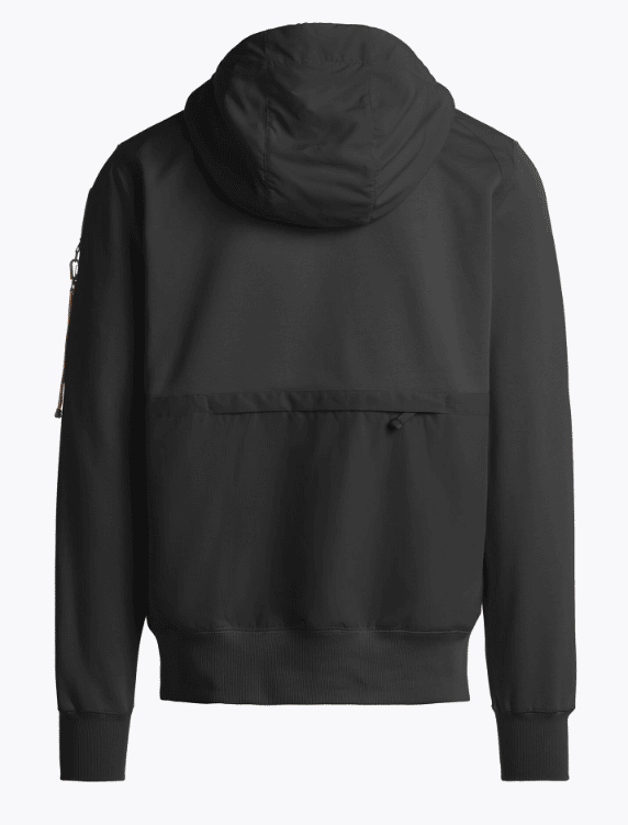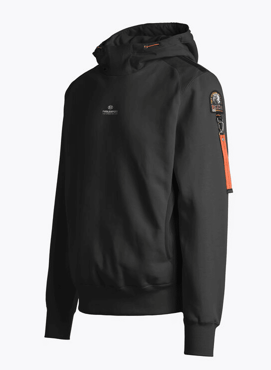 Ce sweat-shirt possède une capuche ajustable grâce à un cordon coulissant ainsi qu’une poche ventrale. Logo et devise Parajumpers imprimés. Bord-côte sur les poignets, le col frontal, les insertions latérales et l’ourlet inférieur, ourlet de poche garni de Lycra. La pièce présente des détails iconiques comme l’écusson et le porte-clés orange amovible. Le tissu est un molleton de coton mélangé, 86 % coton – 14 % polyester, structure diagonale et face arrière légèrement grattée ; la seconde couche de tissu est un micro-ottoman à la finition mate, 100 % nylon.