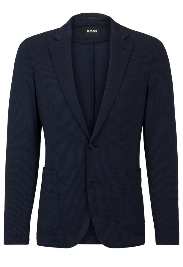 Une veste droite signée BOSS Homme dans une coupe ajustée, confectionnée en seersucker stretch confortable qui se défroisse facilement.